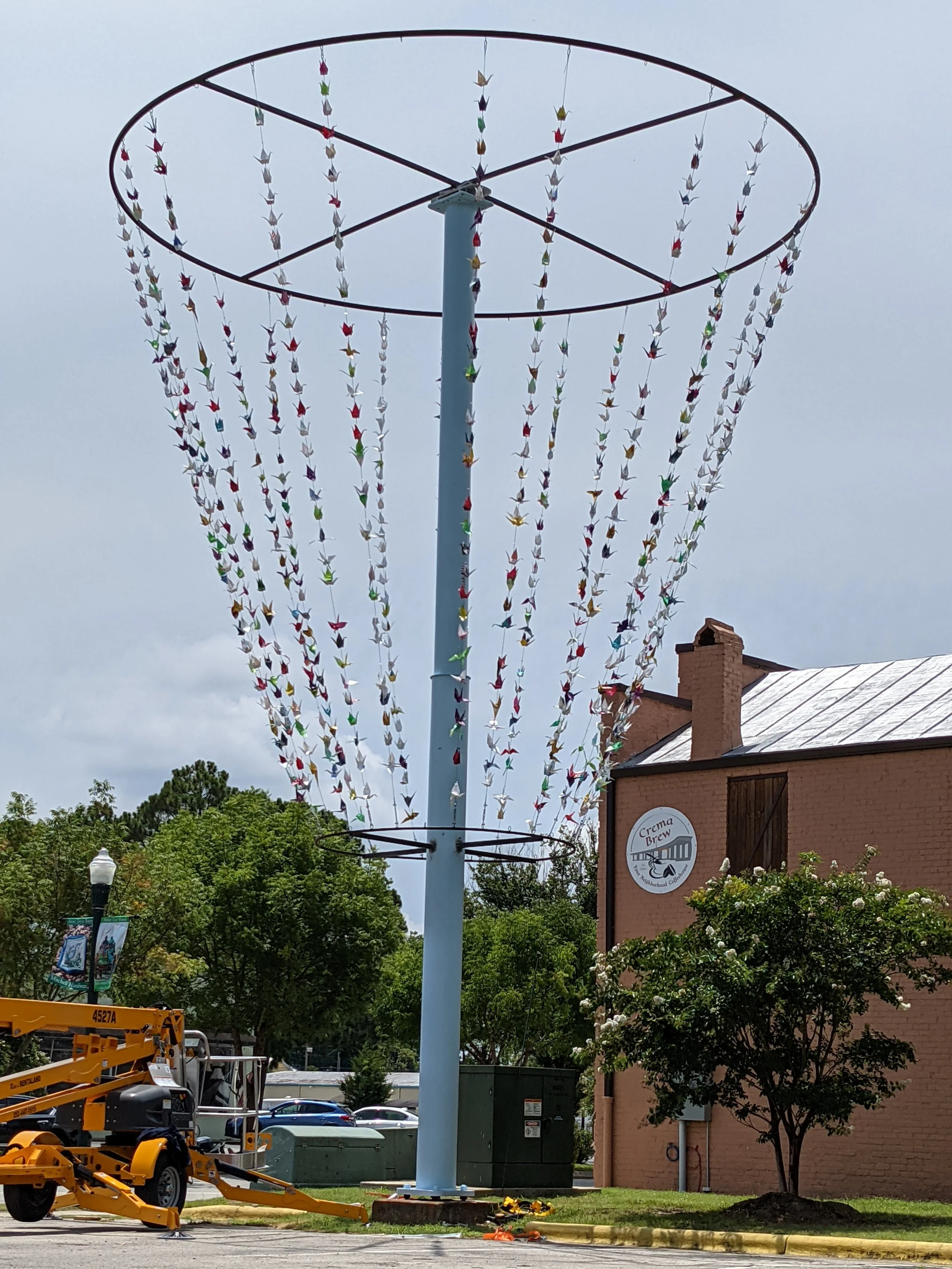 This project was installed on a 35’ former billboard pole in Uptown New Bern. The piece features origami cranes made from Tyvek, folded and dedicated by local community groups, youth groups, and others.